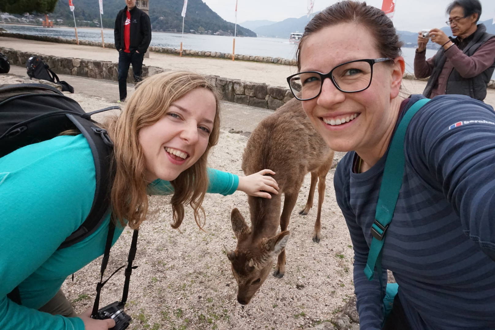 schon von der fähre aus sieht man das tori im wasser. auf der insel angekommen hat uns unser erster weg dann auch zum tori geführt. ausserdem laufen auf miyajima einige zahme rehe rum, die sich streicheln lassen.